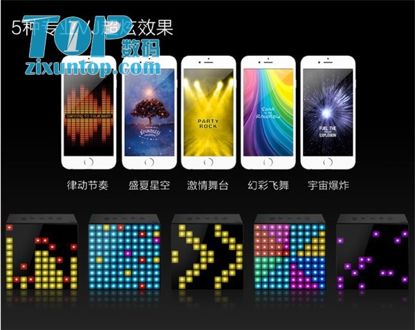 AuraBox是一个简简单单的黑色正方体,屏幕是一块10X10个RGB LED灯板,后面配备带低音振膜的3寸钕铁硼喇叭,做工方面保持了一贯的大厂水准,设计上非常简约现代,在家庭环境中非常容易融入家居。设计的亮点主要是前面的LED面板,不同与市场上直接裸露的led灯珠, aurabox做得有点像30年代红磨坊舞台灯,略带怀旧又很有科技感。箱体顶部的按键和硅胶外壳做成一体,手感不错,除了操控蓝牙音箱基本功能,还有灯效按键可以切换不同模式,如时间,温度及5种不同的舞台灯光效果效果,据官方介绍这几个效果都是与专业舞台VJ师合作,有一定的酒吧效果,实际效果看起来也非常酷炫,配合音乐很是有feeling。